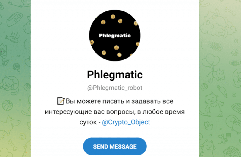 Примером бота наглых жуликов, часто меняющих названия каналов, является Phlegmatic. Админ бота @Crypto_Object успел уже засветиться на многих лохотронах с другими названиями и, продолжает выманивать финансы с помощью этого бота.
